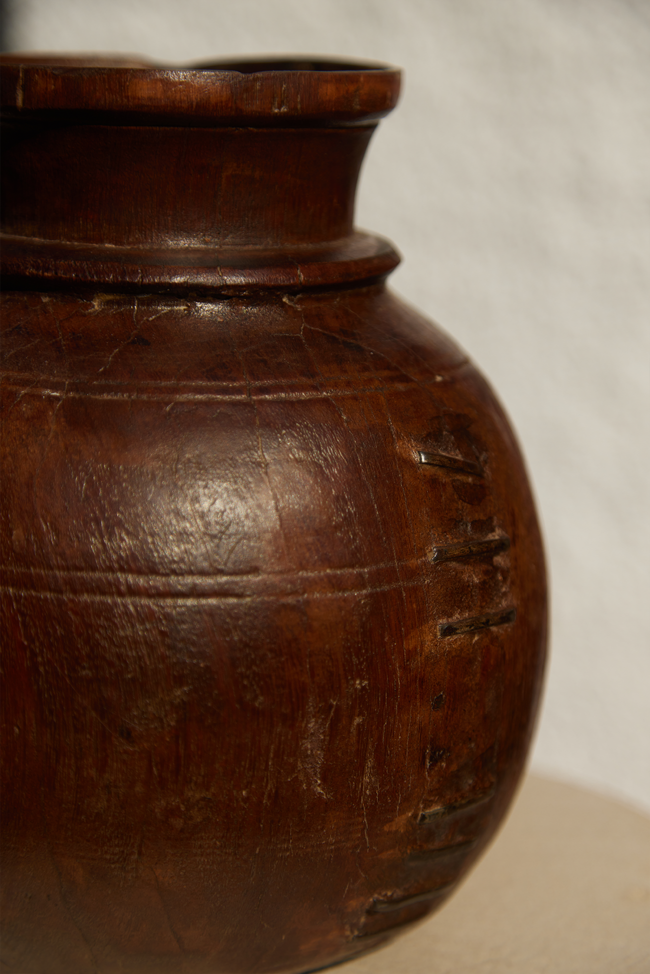 Handcrafted mango wood vase. Decorative item that can be used alone or as a flower vase, for example. It has imperfections from the hand-stitched seams.