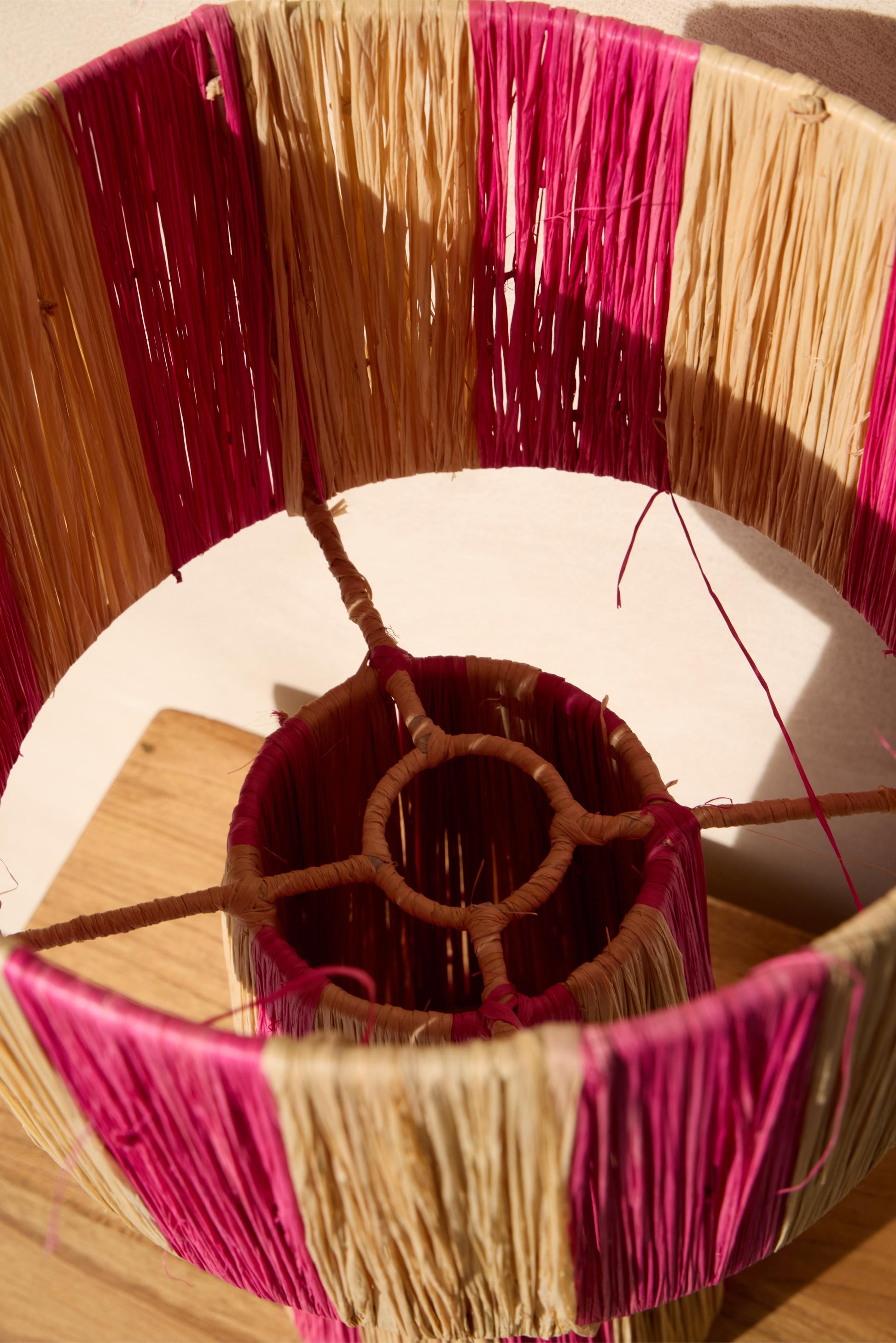 Each lamp combines the natural color of its material, raffia, with a striking color such as orange, green, and purple. The stripes add verticality to these pieces, which stand out for their shape and size.