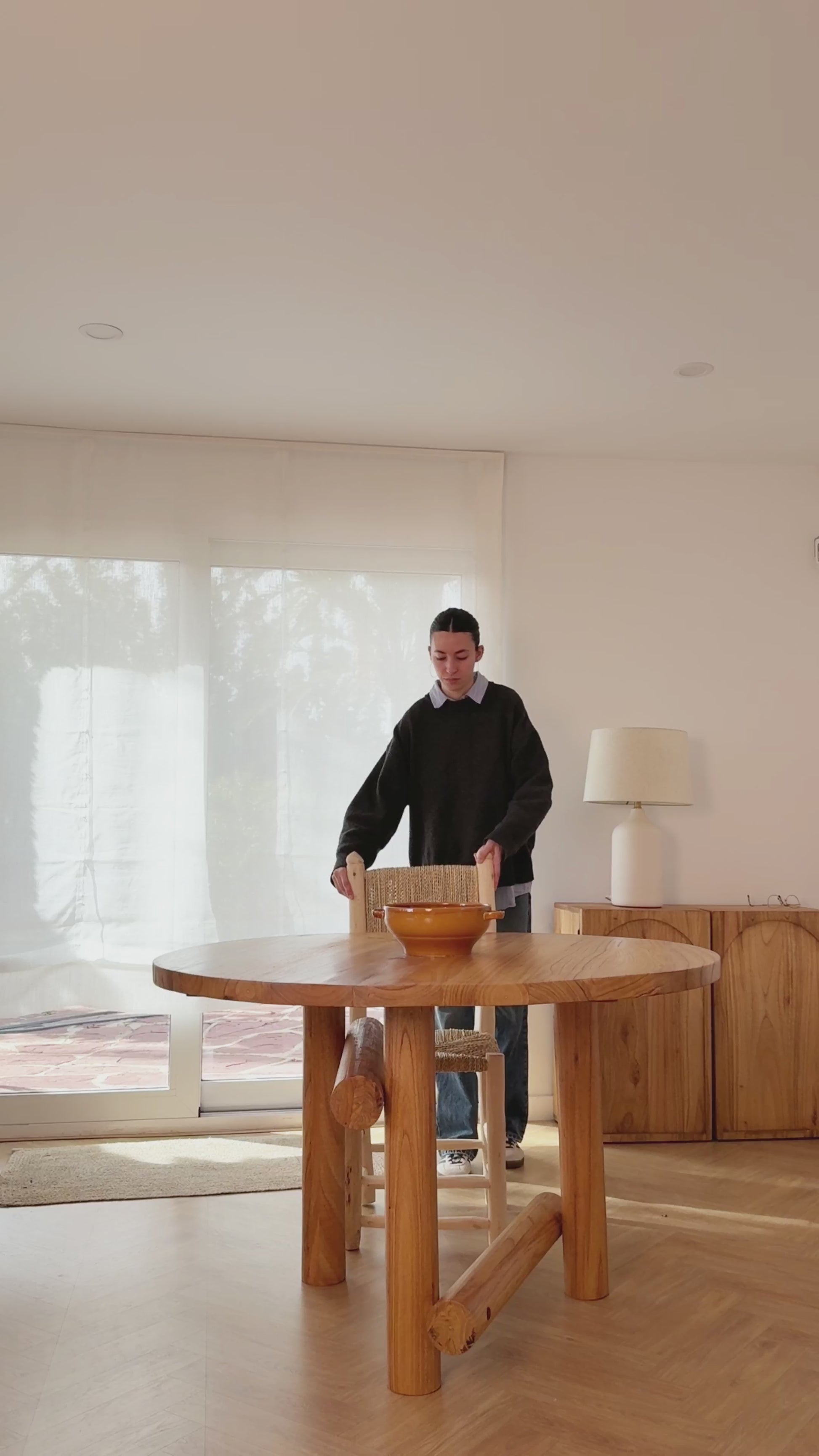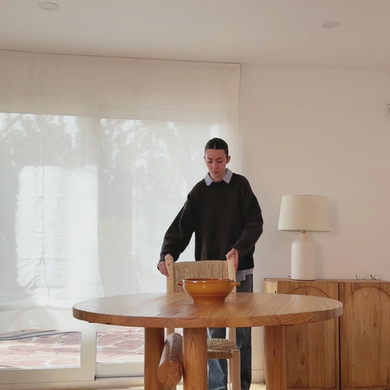 Mesa de salón y comedor de madera maciza de cedro. Realizada con formas cilíndricas escultóricas donde se atan las patas entre sí creando una geometría perfecta.