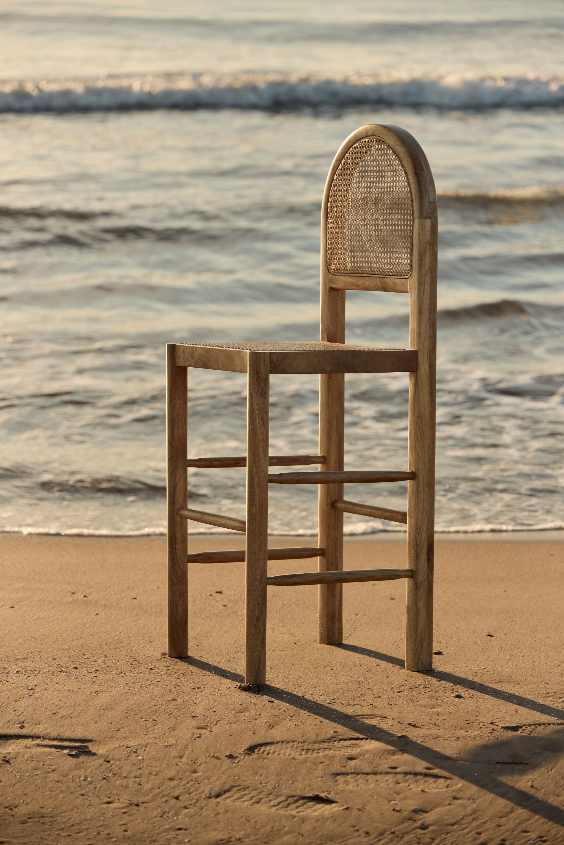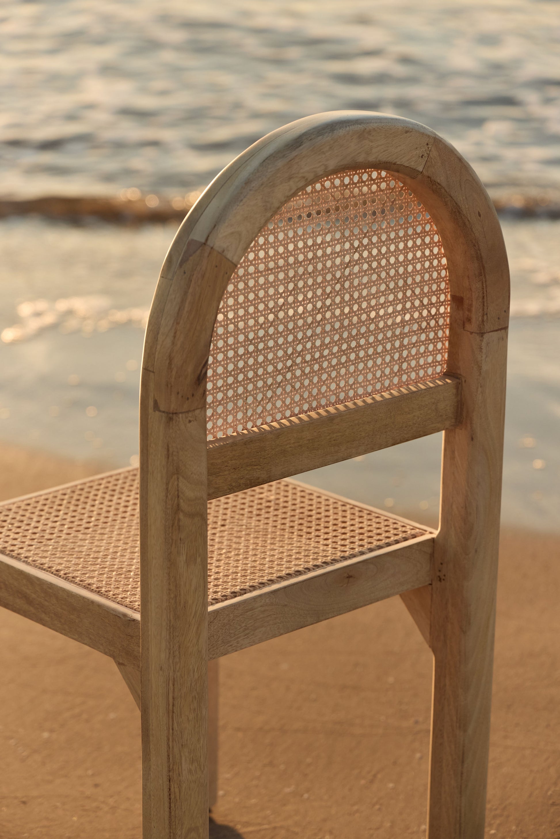 The arched backrest and seat are crafted from hand-woven natural rattan, providing visual lightness, breathability, and ergonomic comfort ideal for everyday use. The straight back and rounded front legs provide stability and a subtle design detail.