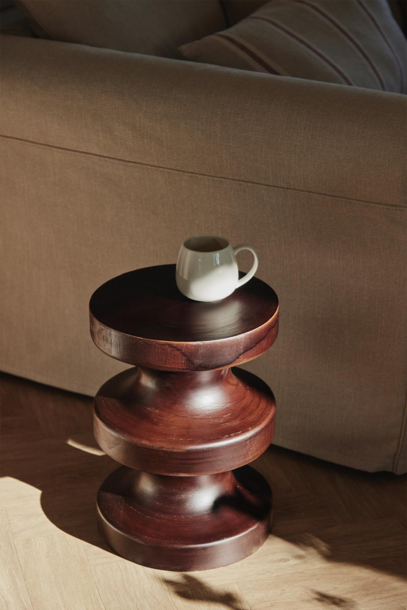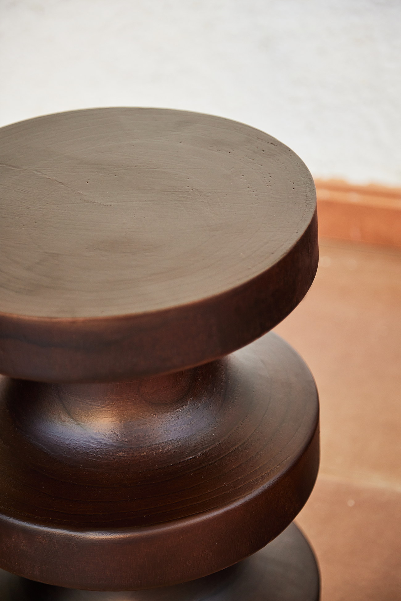 Rounded shapes come together in this elegant and spectacularly designed stool. The dark tone of the wood it's made from makes it versatile in any decor style and adds personality and style to any home. It can be used as a stool, a decorative piece, or even a side table.
