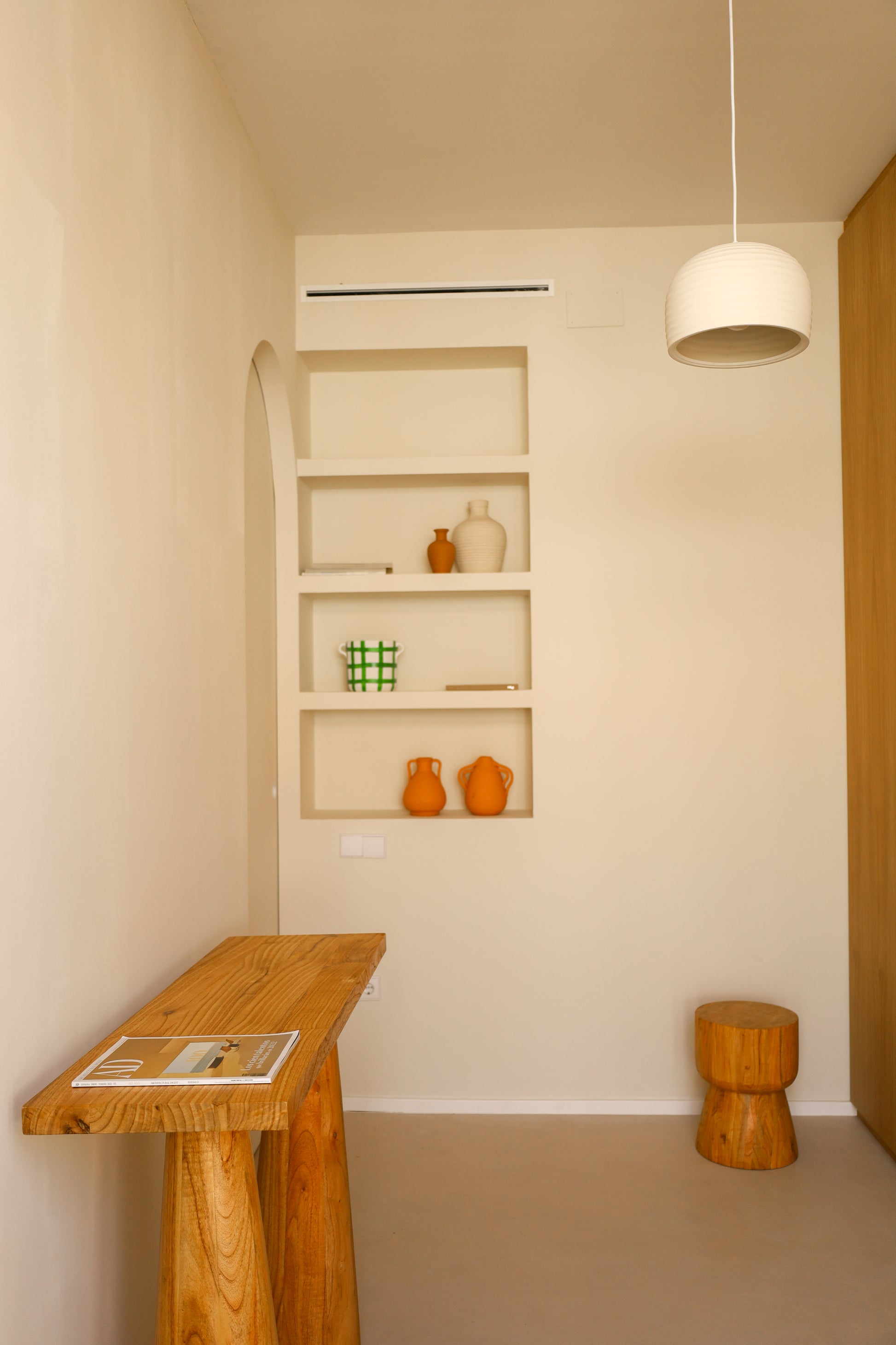 Mesita de madera maciza tipo tótem de diseño sencillo y depurado. La madera de cedro torneada a mano muestra su belleza natural y permite ser utilizada tanto de mesita de noche como de mesita auxiliar.